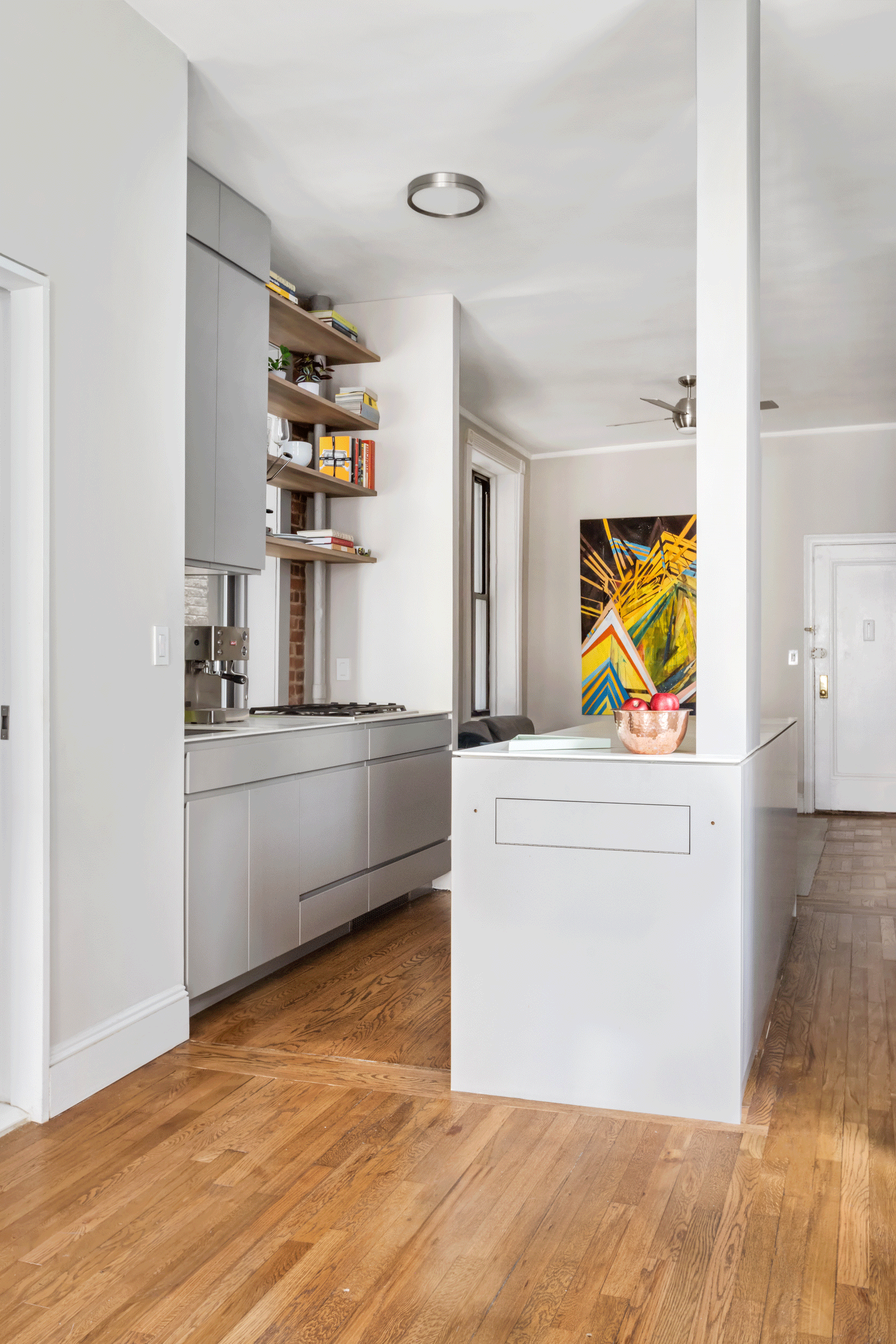 The culmination of the design was to create a custom floor-to-ceiling closet and chest-of-drawers that increased the apartment’s storage and concealed a movable wall to give the bedroom privacy.